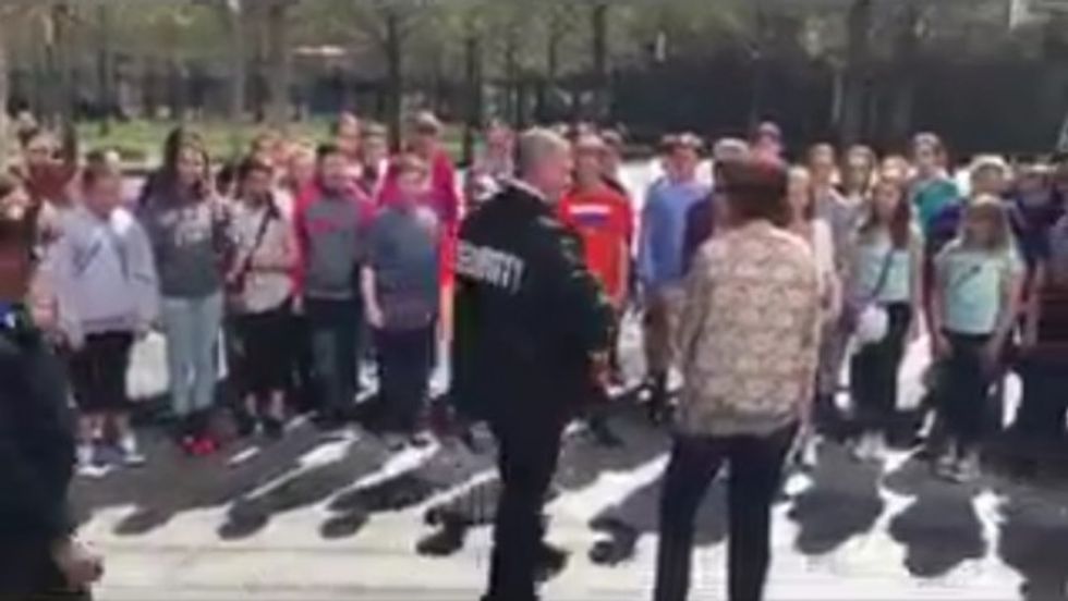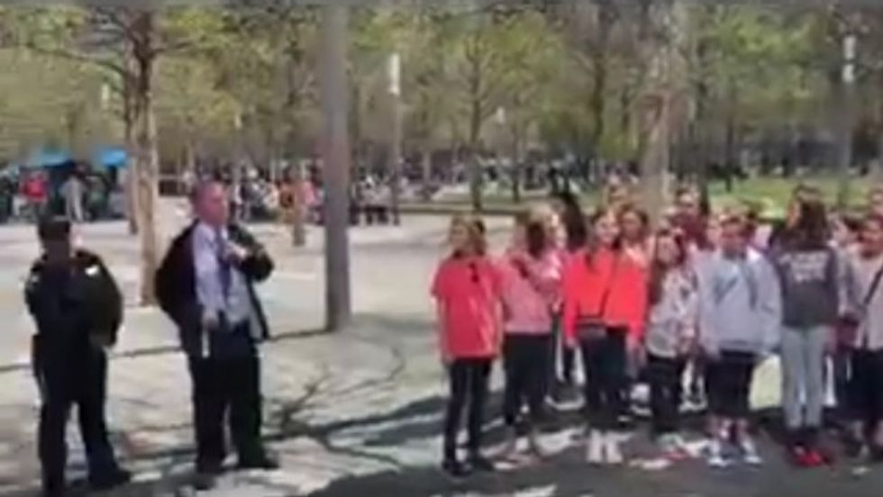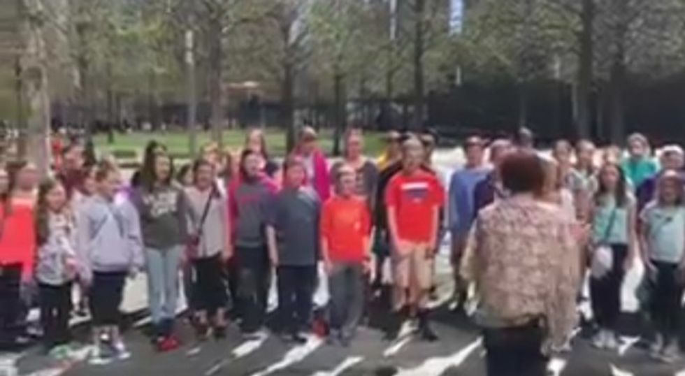 A video posted to Facebook Wednesday showed the group of about 50 middle schoolers just starting a rendition of "The Star-Spangled Banner" outside the 9/11 memorial.