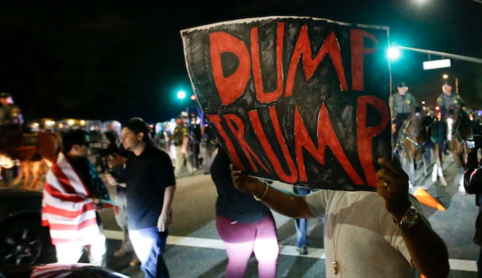 Anti-Trump demonstrators gather outside the Rider Jet Center ahead of a rally with Republican presidential candidate Donald Trump on April 24, 2016, in Hagerstown, Md.  (MOLLY RILEY/AFP/Getty Images)