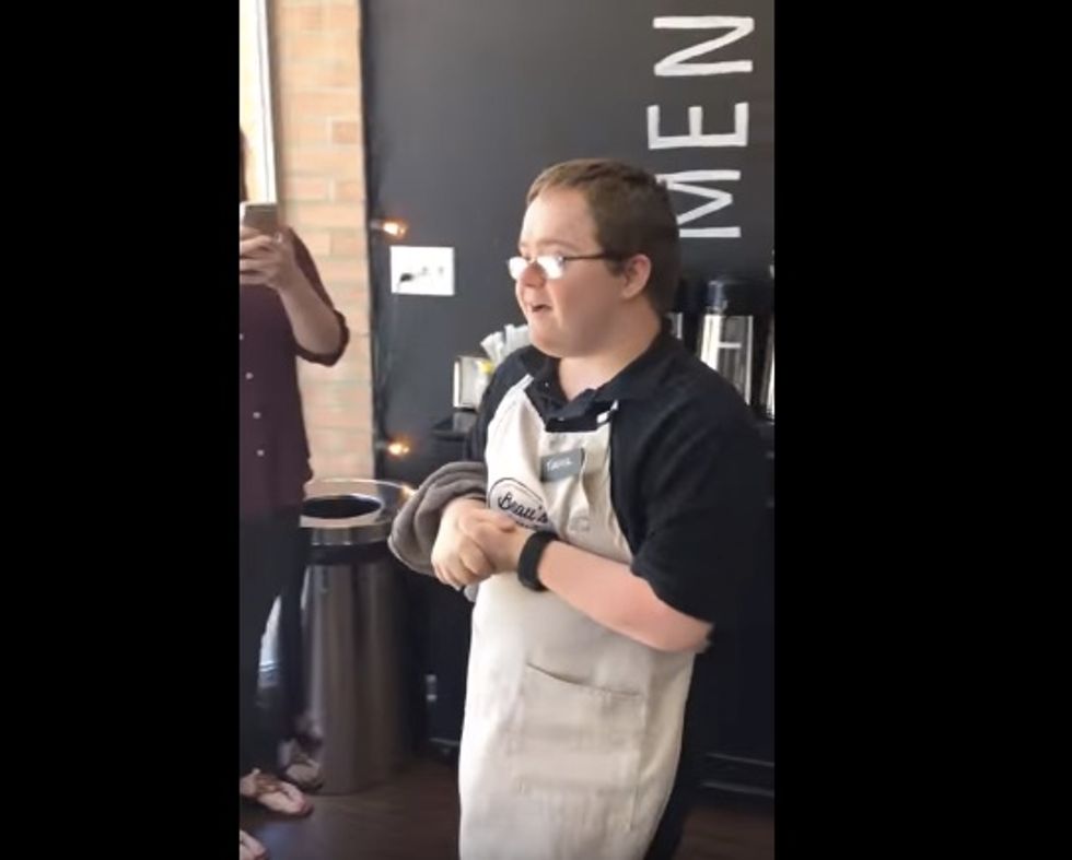 The video, which was posted to Beau's Coffee Shop's Facebook page Monday, shows teen Lillie Wright, the daughter of the coffee shop's owner, Amy, approaching an employee named Trevor inside the Wilmington store. Trevor, who has Down syndrome, can be seen going about his assigned tasks while wearing an apron before Lillie approaches him.