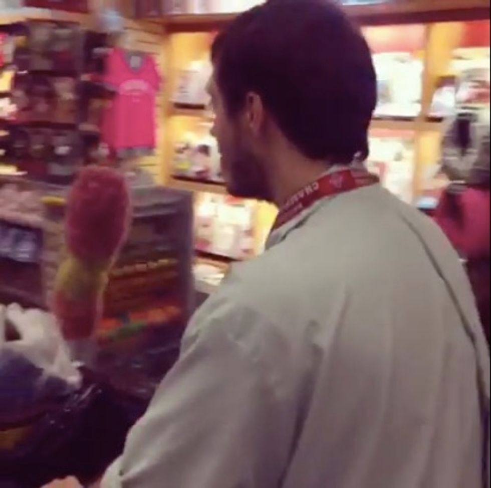 Instead of verbally responding, the young man furiously shakes his head “no” and continues to push his cleaning cart without making eye contact.