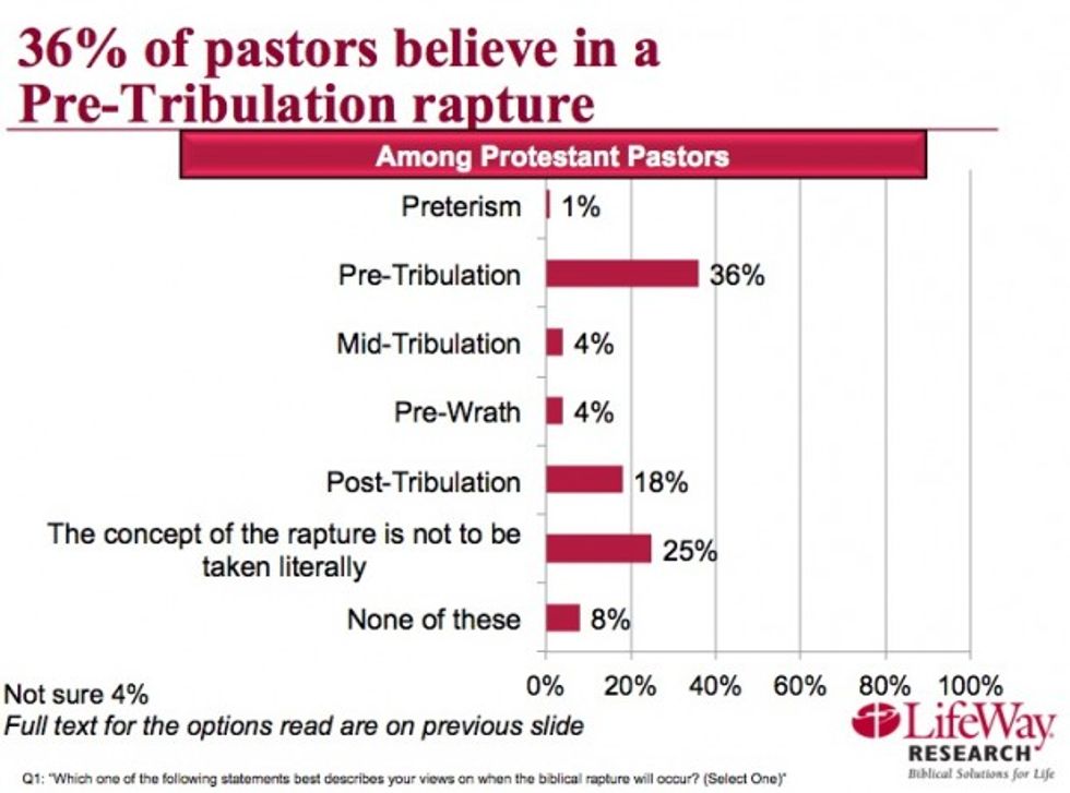 Overall, 36 percent of pastors — the largest proportion by far — aligned themselves with the pre-tribulation view, with the second largest proportion (25 percent) saying that "the concept of the rapture is not to be taken literally." An additional 18 percent aligned themselves with the post-tribulation belief that the rapture and the second coming of Christ are essentially one in the same.