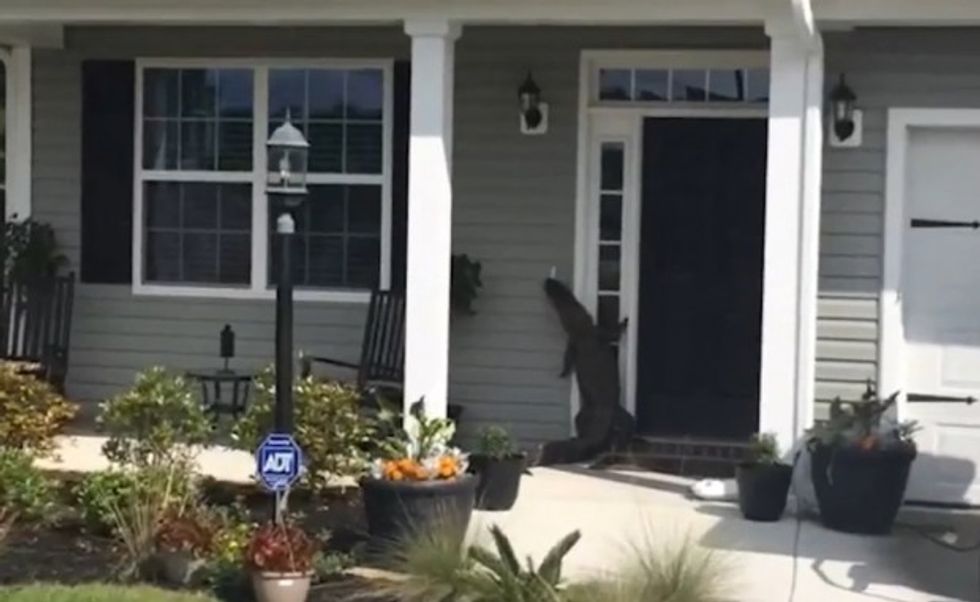 Families in Moncks Corner, South Carolina, received an unexpected visitor in their neighborhood Monday morning when an alligator meandered through their yards and was caught on camera throwing itself against the front door of one home.