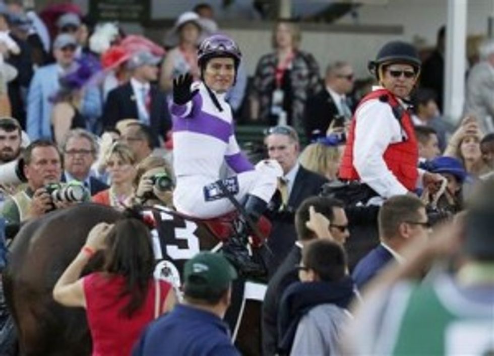 Mario Gutierrez celebrates after riding Nyquist to victory during the 142nd running of the Kentucky Derby horse race at Churchill Downs Saturday, May 7, 2016, in Louisville, Ky. (AP Photo/Garry Jones)