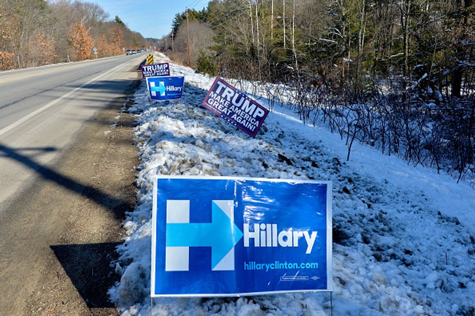 HUDSON, NH - FEBRUARY 07: Hillary Clinton and Donald Trump campaign signs are seen on Route 111 in advance of the New Hampshire First-In-The-Nation Primary on February 7, 2016 in Hudson, New Hampshire. (Photo by Paul Marotta/WireImage)
