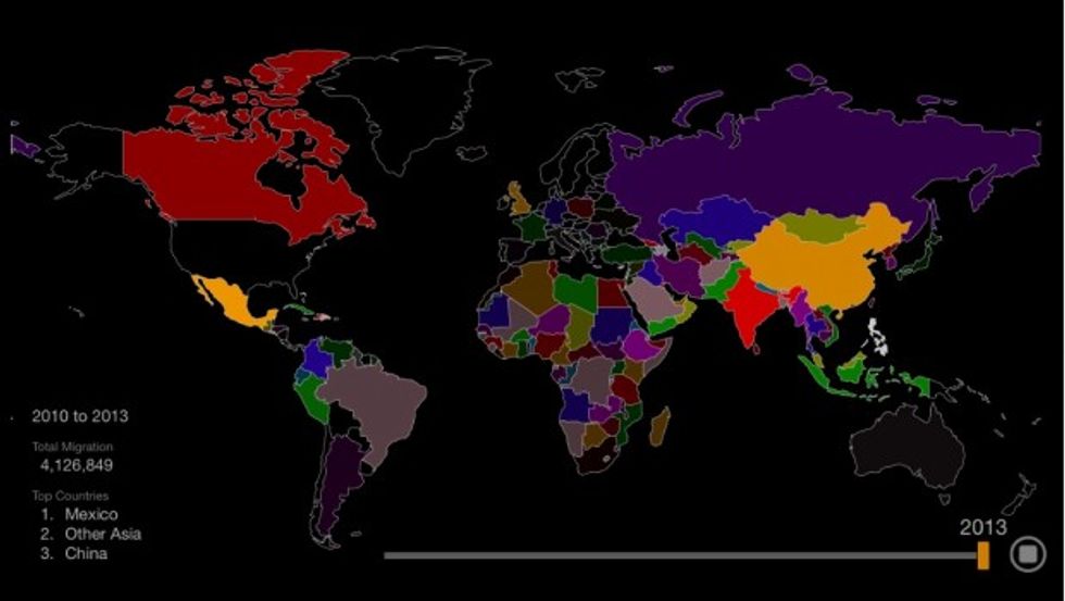 Animator Max Galka designed a time-lapse interactive map of world population movement to the United States from 1820 to 2013, and posted the map to his blog, Metrocosm, which collects and displays statistical data in creative ways.