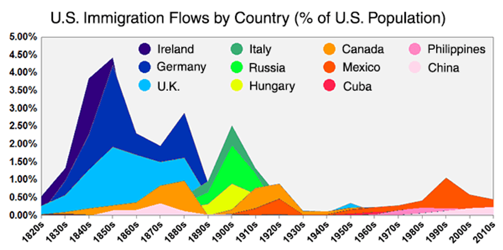 His latest creation shows the countries that sent the most people to the United States since 1820, with each dot representing 10,000 people.
