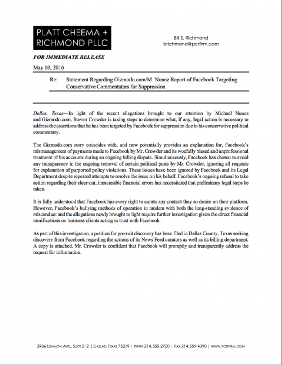 Crowder’s Dallas-based attorney, Bill Richmond, said in a Tuesday statement that his office has filed a petition for “pre-suit discovery” in Dallas County, Texas, “seeking discovery from Facebook regarding the actions of its News Feed curators as well as its billing department.” The action, he said, is a step toward discovering "what, if any, legal action is necessary to address the assertions that he has been targeted by Facebook for suppression due to his conservative political commentary."