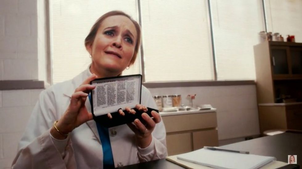 Portraying the scene Saporta was describing, Bee was scene dressed as a "doctor" at a crisis pregnancy center with a Bible, rosary and crucifix, all sitting beside a specula in her office. As Bee performed an ultrasound on a woman, she joked, "I hear a heartbeat," later mimicking an unborn baby trying to talk to its mother.