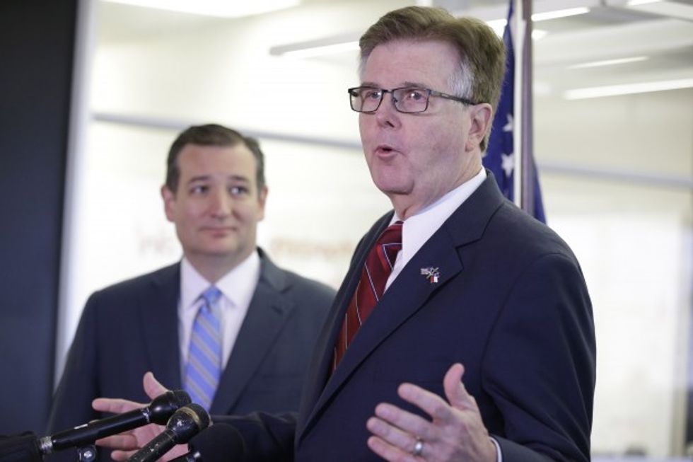 Texas Lt. Gov. Dan Patrick, right, introduces Republican presidential candidate Ted Cruz speaks at a press conference Monday, Oct. 26, 2015, in Houston. (AP Photo/Pat Sullivan)