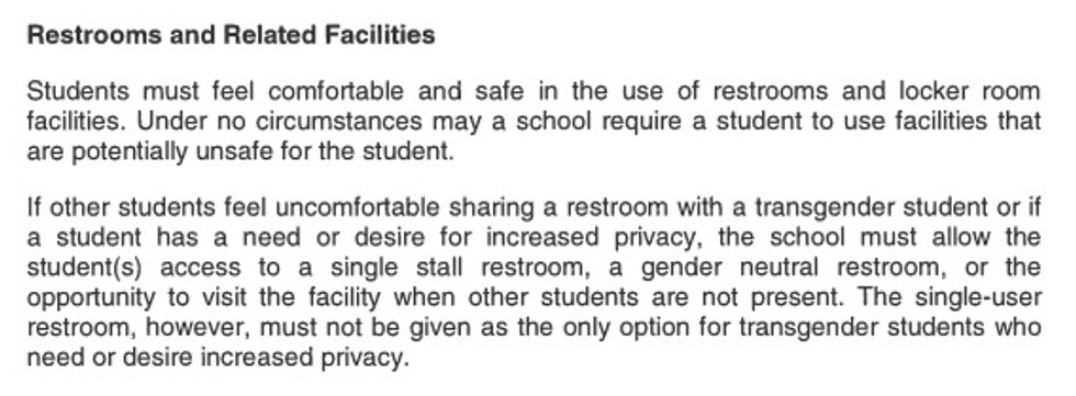 According to NPR, the guidelines, which were announced on April 26, call on district personnel to support and acknowledge students' gender identity, while also having ramifications for locker rooms and restrooms; the regulations call for students to have access to "the gender identity that each student consistently and uniformly asserts."