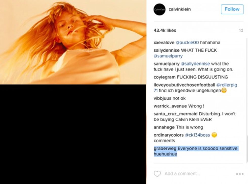 Negative comments on the photo, which is intended to help advertise Calvin Klein's spring 2016 line, were plentiful, with some so shocked that they turned to expletives to highlight their total discontent.