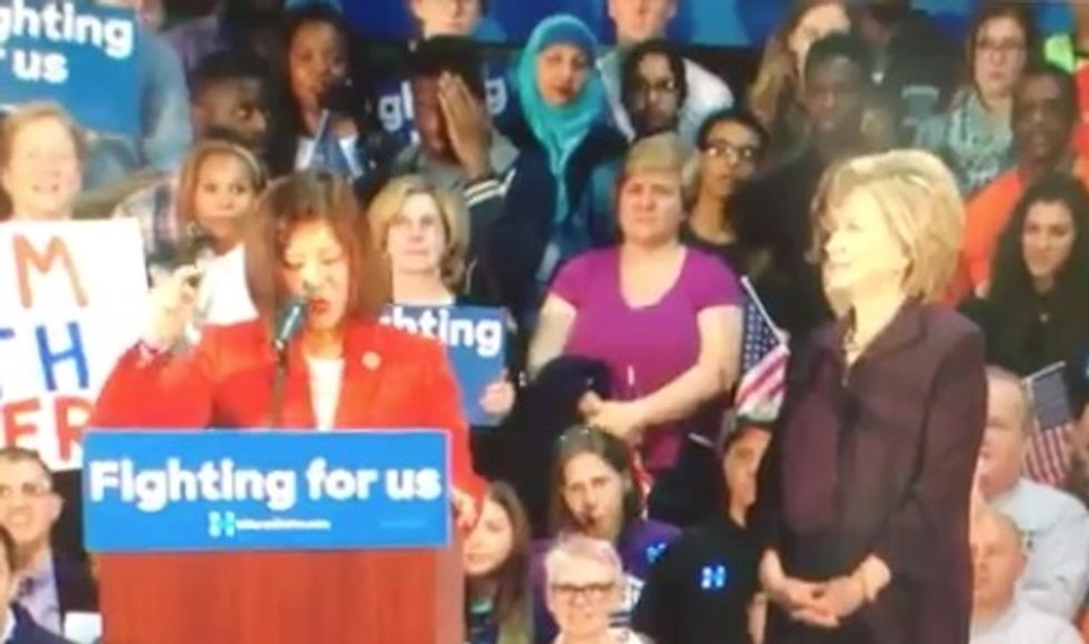 A politician who introduced Hillary Clinton at a New Jersey rally Wednesday stumbled on a key phrase while reciting the Pledge of Allegiance.