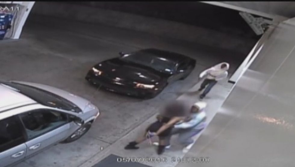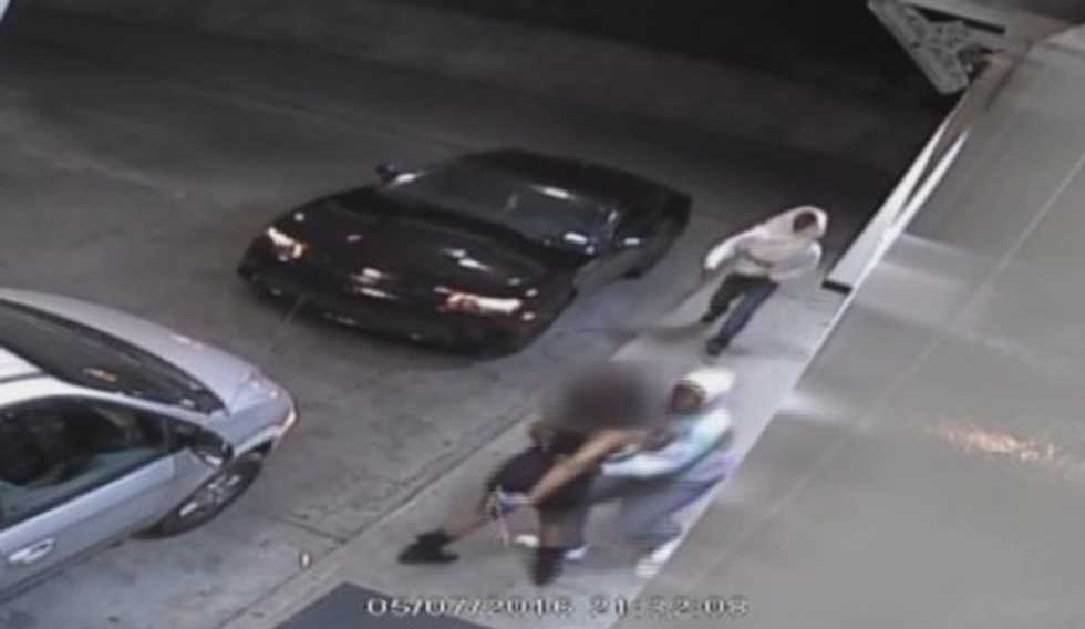 Security footage shows the two men approaching her as she returns to her car at the gas station and then appearing to attempt to rob her.