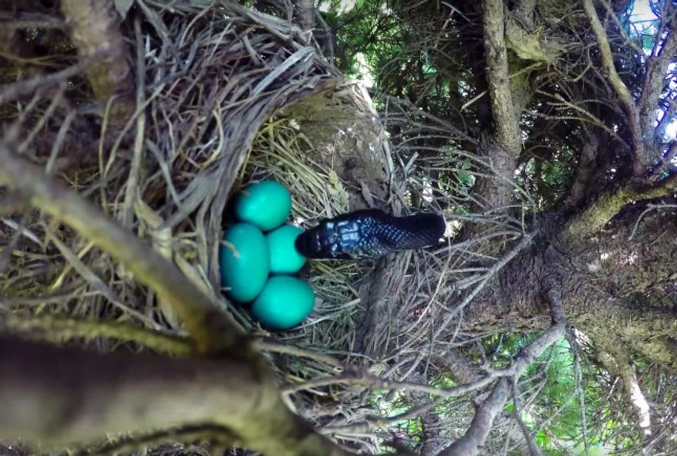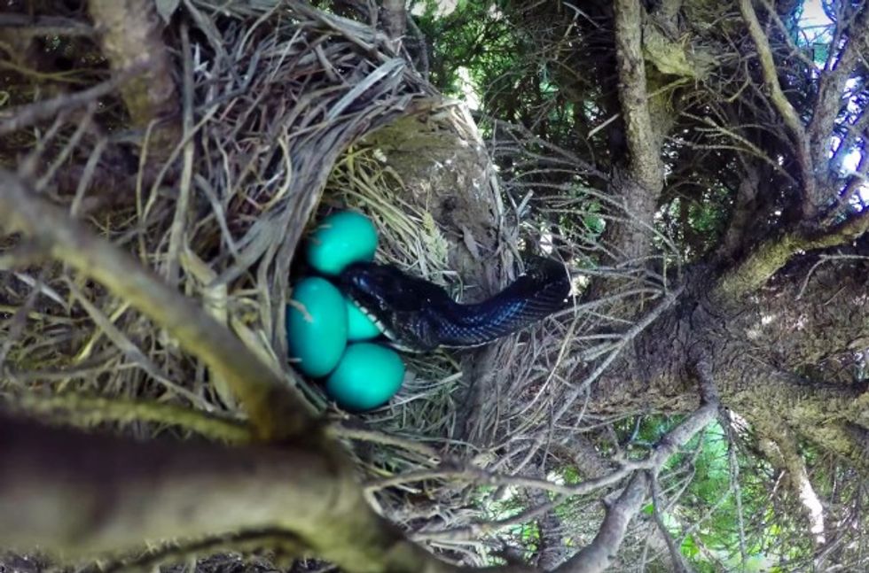 But after a bird spent some time with the eggs and flew off, the video camera instead caught an unwelcome visitor slithering toward the nest.