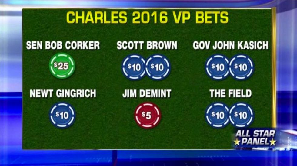 Krauthammer used $100 in "casino chips" to illustrate to the Fox audience the odds of various individuals scoring the VP nomination.