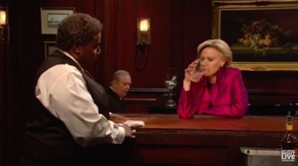 A cheery Clinton then announces that she’s heading home for the evening and tells the bartender (Kenan Thompson) not to work too late.