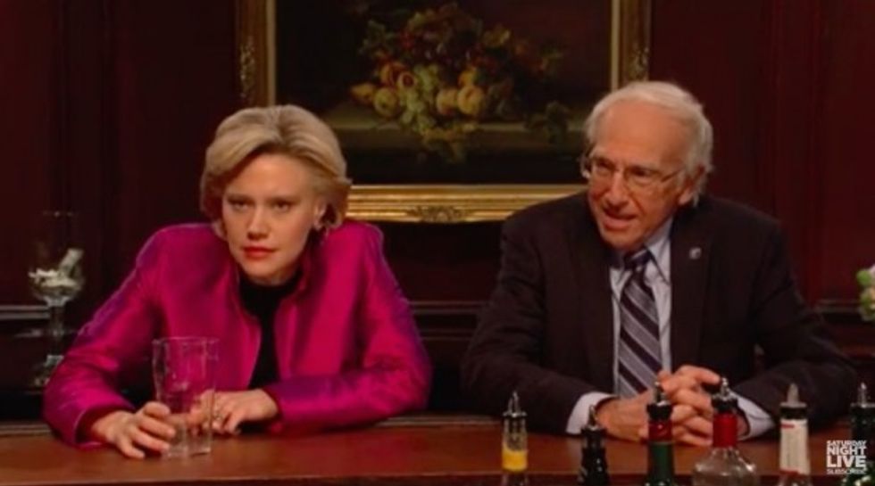 Bernie (David) then joins Hillary (McKinnon) at the bar, where the two civilly insult each other, covering everything from Hillary’s distinct taste in suit jackets (“It looks like you were just elected by the Galactic Council!”), to the email scandal (Sanders: “Remember when I told everyone to stop talking about your ‘damn emails’? What a shmuck! So stupid!”), to the “special” role Bernie will have in the future Clinton administration: “Don’t worry! I promise I’m going to have a very special role for you in my administration. How would you like to be — wait for it — the Senator from Vermont!”