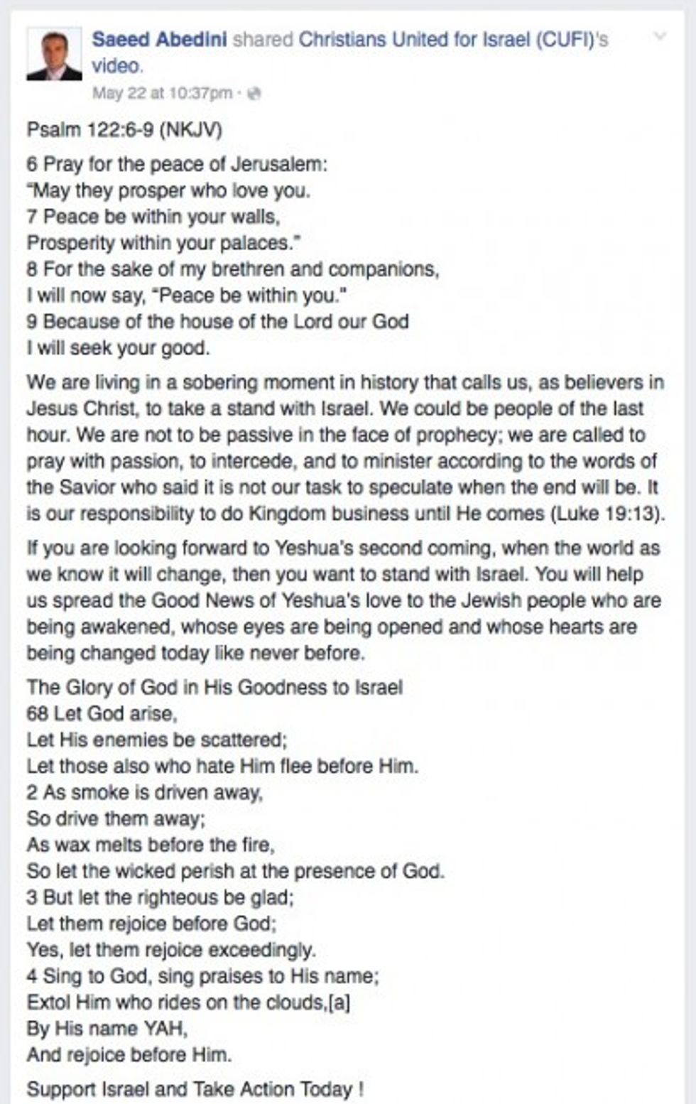Pastor Saeed Abedini, the American citizen who was was detained for more than three years in Iran before being released in a prisoner swap between the U.S.and Iran earlier this year, penned a Facebook post on Sunday that called for Christians to "take a stand with Israel."