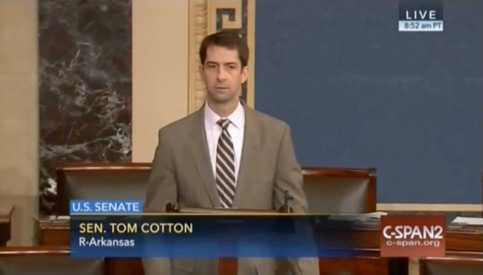 “As a junior senator, I preside over the Senate,” Cotton said. “I usually do in the morning, which means I’m forced to listen to the bitter, vulgar, incoherent ramblings of the Minority Leader. Normally, like other Americans, I ignore them. I can’t ignore them today, however.”