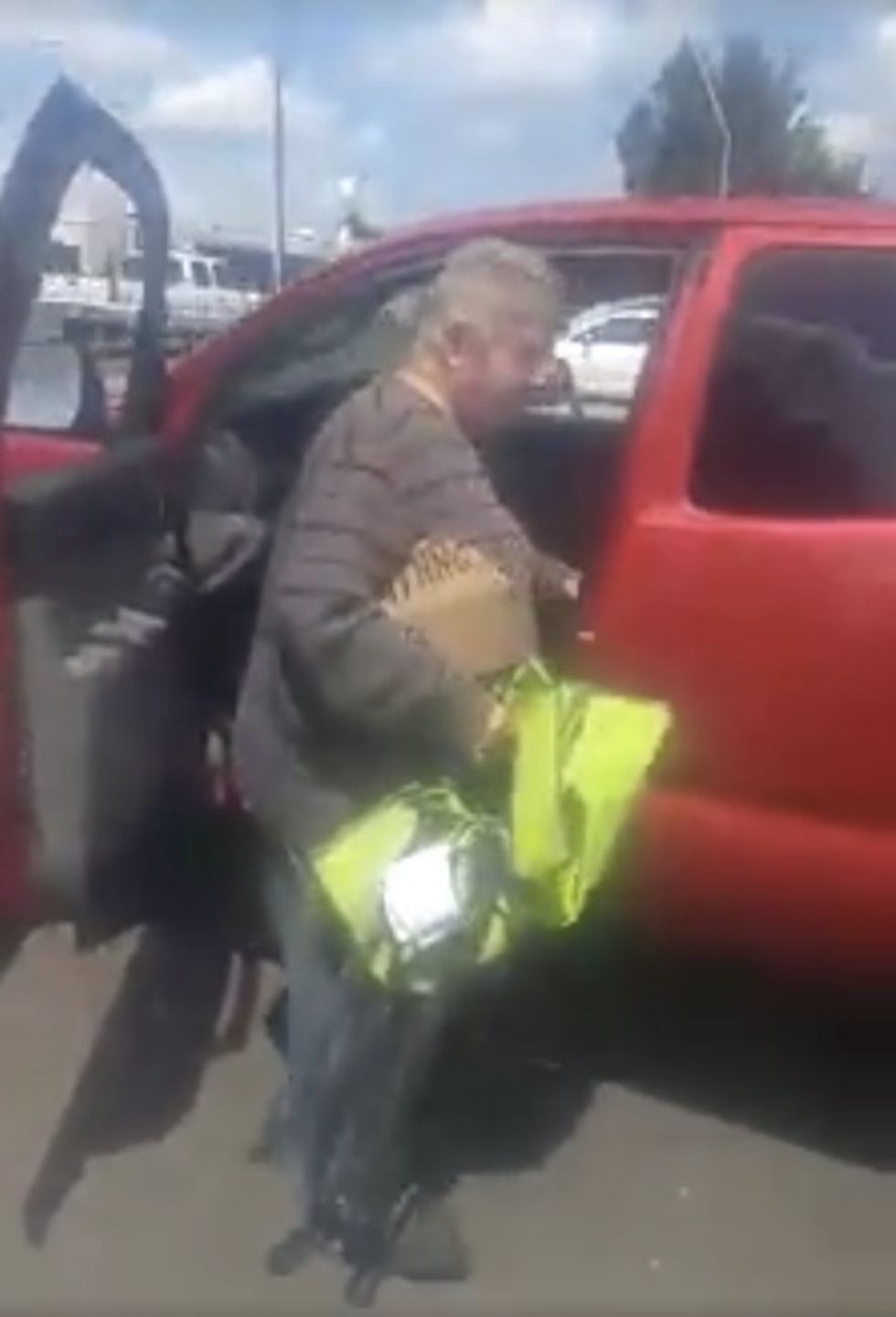 While hollering at the panhandler, Severs got up close to the vehicle information sticker on the frame of the driver's side door and said the truck was manufactured in December 2014 — and then yelled at him some more.