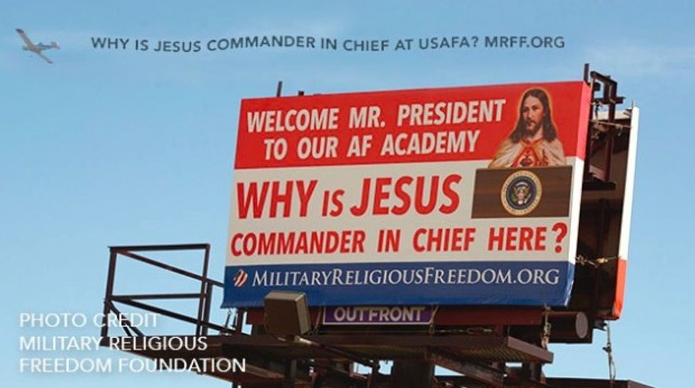 The billboard will be displayed from May 23-June 5. As for the airplane, it will show a message that reads, "WHY IS JESUS COMMANDER IN CHIEF AT USAFA? MRFF.ORG" on May 31 and June 1 — and the 15-second TV spot will fun 1,322 times from May 27-June 2 on MSNBC, CNBC, CNN and Fox News, according to the statement.