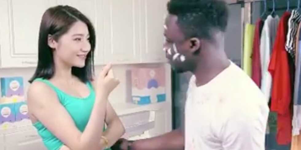 Qiaobi detergent released the ad, showing an Asian woman doing laundry when a black man, covered in paint, appears at the door and winks. He approaches the woman but when he gets close, the Asian woman shoves his entire body into the washer.