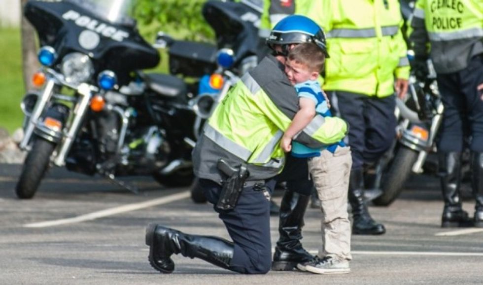 Then suddenly, outside the funeral home, King's eyes caught a glimpse of something unforgettable: A little boy running up to a police officer and hugging him while the officer got down on a knee and hugged him back.