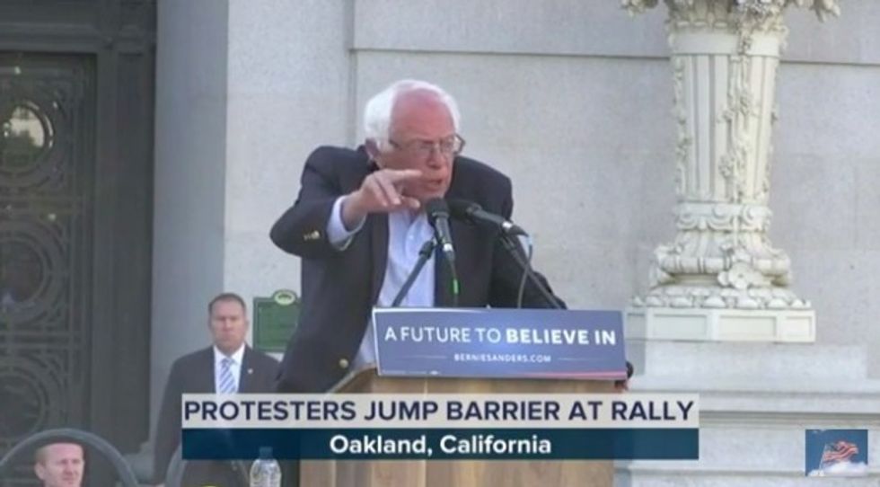 Sanders' security stopped the protesters before they could reach the Democratic presidential hopeful, who was addressing supporters at Frank Ogawa Plaza at Oakland's City Hall Monday.