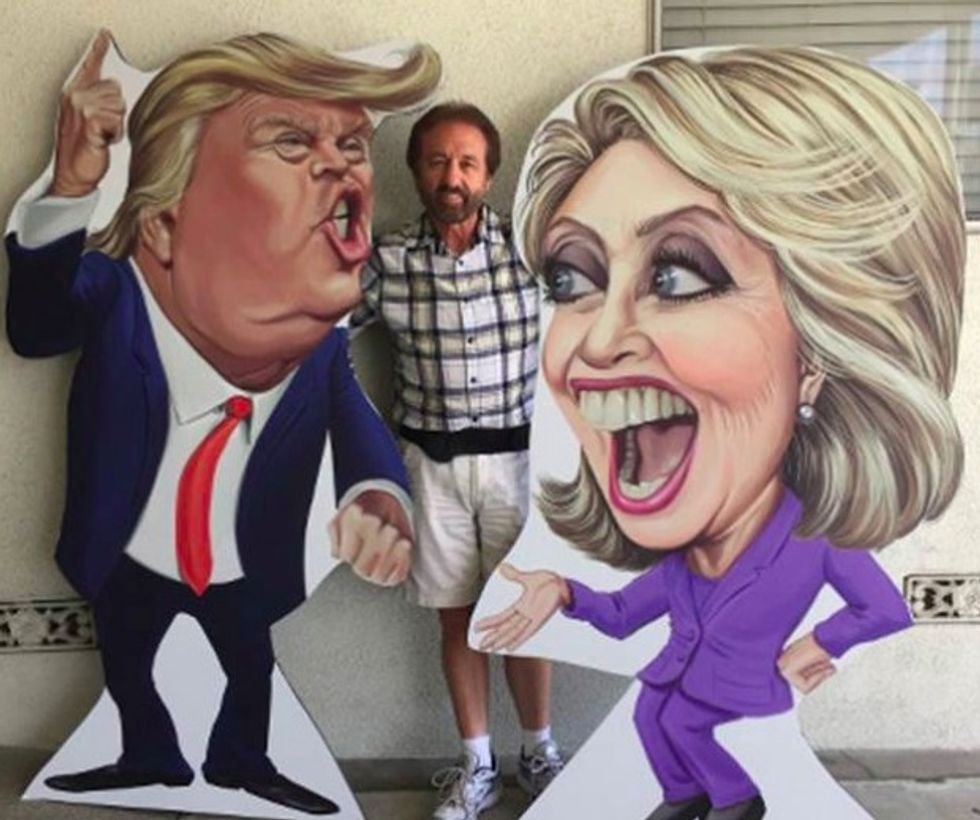 Evangelist Ray Comfort is seen standing next to giant caricatures of Donald Trump and Hillary Clinton (Ray Comfort)