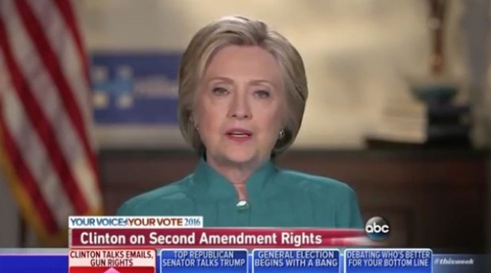 Democratic presidential frontrunner Hillary Clinton declined to say if she thinks the Second Amendment guarantees the constitutional right to bear arms during an interview Sunday with ABC’s George Stephanopoulos.