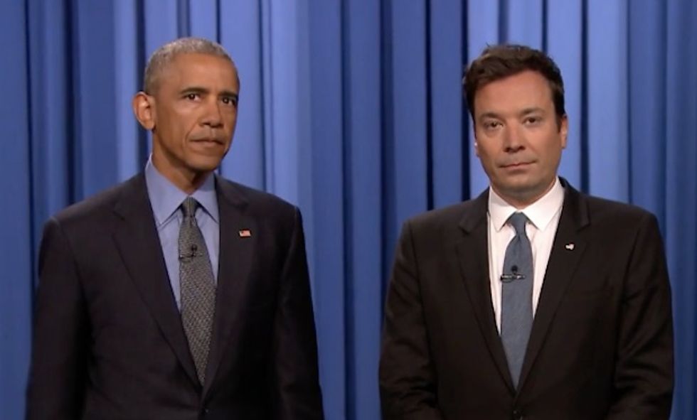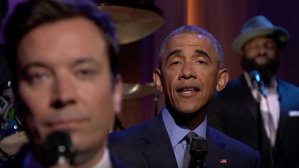 In addition to sitting down for an interview with Jimmy Fallon, President Barack Obama joined the "Tonight Show" host Thursday during the monologue for one of Fallon's signature bits, "Slow Jam the News."