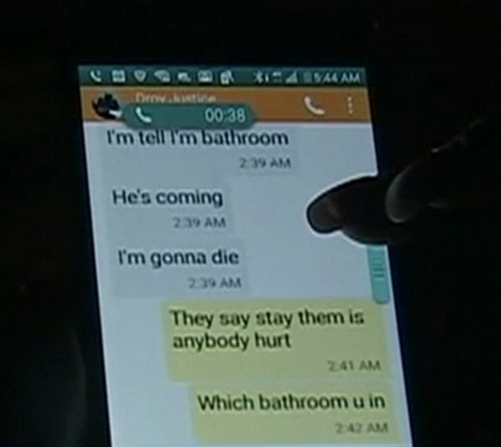 "No," he wrote four minutes later. "Still here in bathroom. He has us. They need to come get us."