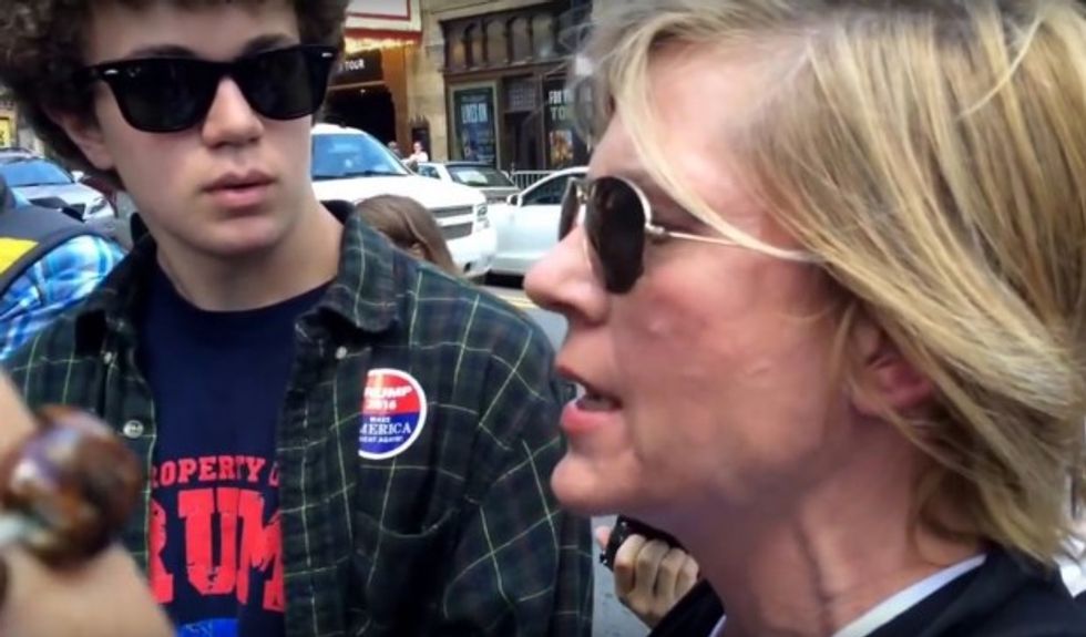 But the teen — who indicated he's 16 in one of a number of videos taken during the fracas — seemed unfazed. He was accompanied by three white youths who also appeared to support Trump — given their unison chant of "T-R-U-M-P, we're gonna trump Hillary!"