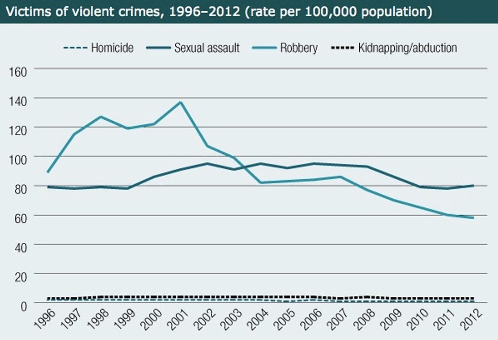 -In the last six years, the rate of robbery victimisation has steadily declined from 86 per 100,000 in 2007 to 58 per 100,000 in 2012. Generally, the rate of robbery victimisation has been declining since 2001.-The rate of sexual assault victimisation increased to 80 per 100,000 in 2012. The last increase in the rate of victimisation was seen in 2006. The rate of victimisation in 2012 is at a similar rate to what it was in 1996, when the rate was 79 per 100,000.