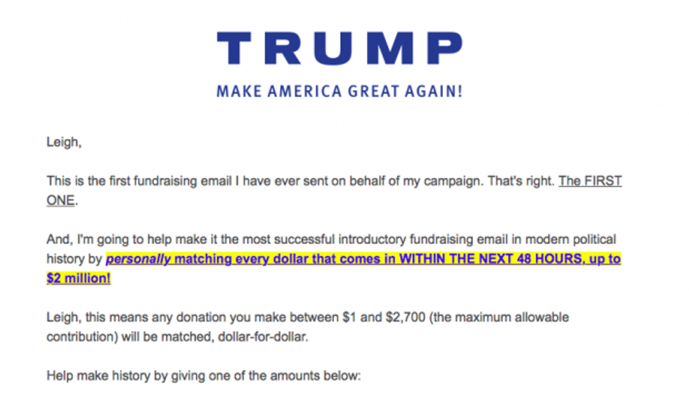 Trump, who often bragged on the primary trail about self-funding his campaign, pointed out that this is the first fundraising email he's sending on the campaign's behalf. He added that he plans to make it "the most successful introductory fundraising email in modern political history" by pledging to personally match all donations in the next 48 hours, up to $2 million.