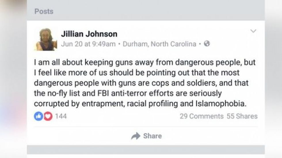 "I am all about keeping guns away from dangerous people, but I feel like more of us should be pointing out that the most dangerous people with guns are cops and soldiers, and that the no-fly list and FBI anti-terror efforts are seriously corrupted by entrapment, racial profiling and Islamophobia," Durham City Councilwoman Jillian Johnson posted.