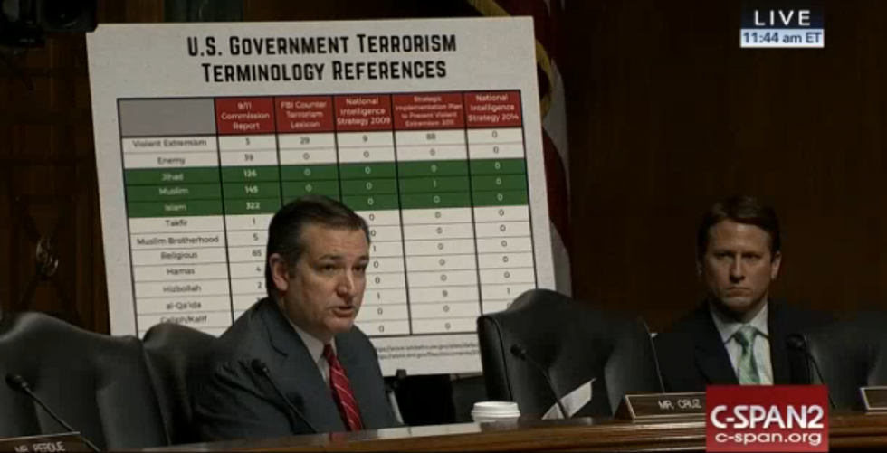 Cruz began by comparing the number of references to “Jihad,” “Muslim,” and “Islam” found in the 9/11 commission report to the number found in several of the Obama administration’s intelligence and counterterrorism materials.