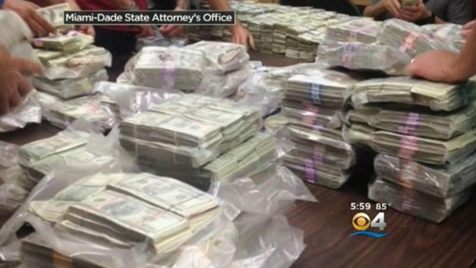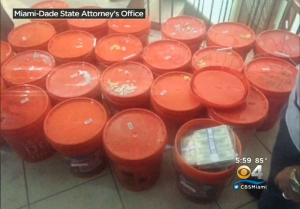 The buckets were loaded onto the back of a pickup truck and hauled to the Miami-Dade police department, where the bills were painstakingly entered into money-counting machines.