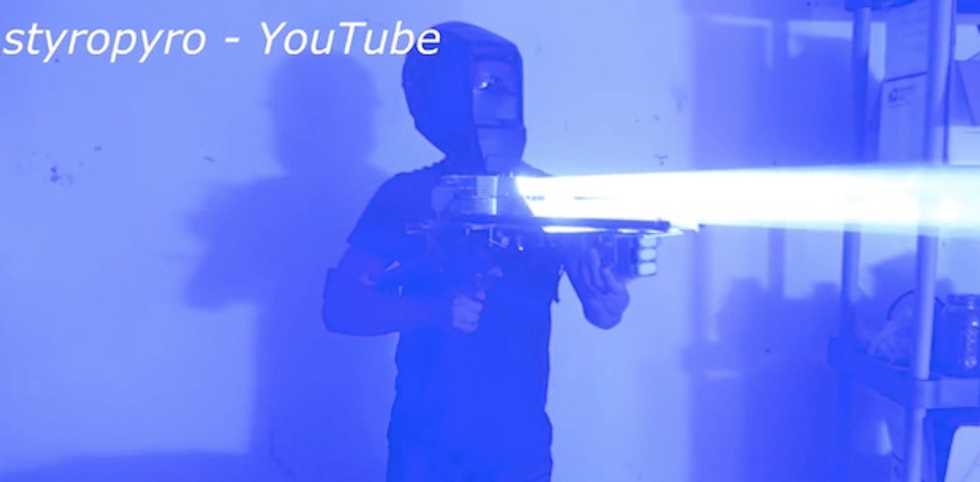 In his latest video, the young inventor shows off a device he calls a "200W LASER BAZOOKA!"