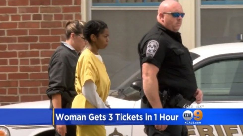 A California woman was arrested last weekend after getting three speeding tickets within an hour while driving in Pulaski County, Virginia, KCAL-TV reported.
