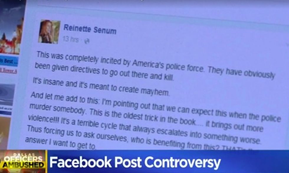 What did Reinette Senum write in her now-deleted post? “This was completely incited by America’s police force. They have obviously been given directives to go out there and kill.” She also wrote that "we can expect this when police murder somebody. It's the oldest trick in the book ..."