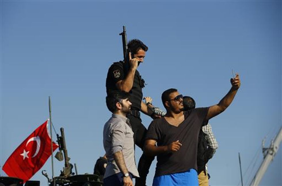 Fighter jets buzzed overhead, gunfire erupted outside military headquarters and vehicles blocked two major bridges in Istanbul. Soldiers backed by tanks blocked entry to Istanbul's airport for a couple of hours before being overtaken by pro-government crowds carrying Turkish flags, according to footage broadcast by the Dogan news agency.