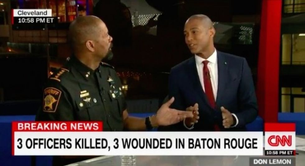 Clarke, a regular CNN contributor, blamed the recent streak of anti-cop violence on the "hateful ideology called Black Lives Matter," but Lemon tried to get the sheriff to temper his response and “keep the volume down." When that didn't work, the CNN veteran cut to a break.