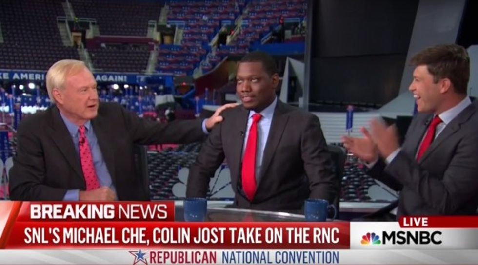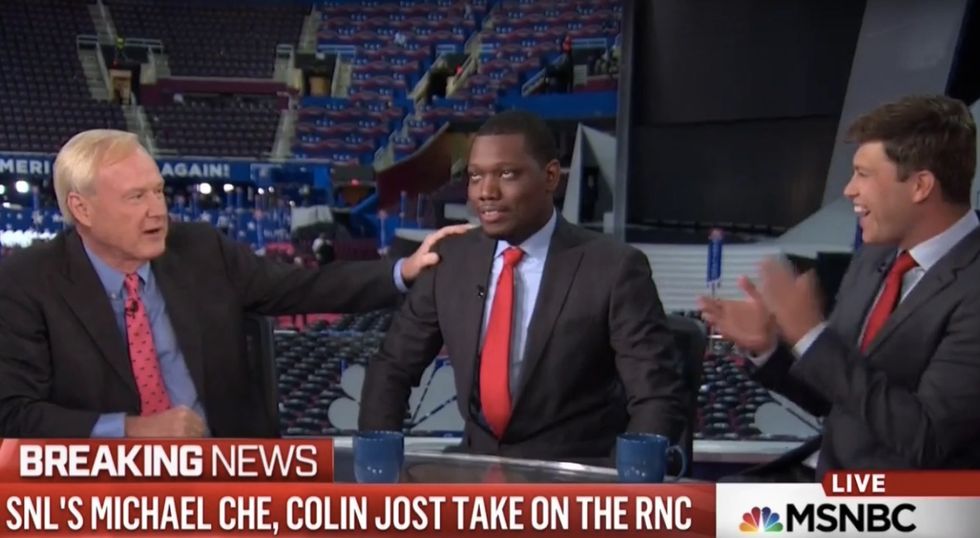 Matthews shared his desk with "Saturday Night Live" cast members Michael Che and Colin Jost, co-anchors of the show's spoof news segment "Weekend Update." Discussing what he deemed the lack of diversity at the RNC, Matthews suddenly delved into awkward territory with Che, seated to his left.