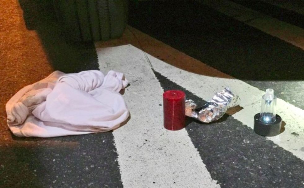 The object turned out to include a candle and a harmless electrical component. A police photo showed them displayed beside foil and white cloth.