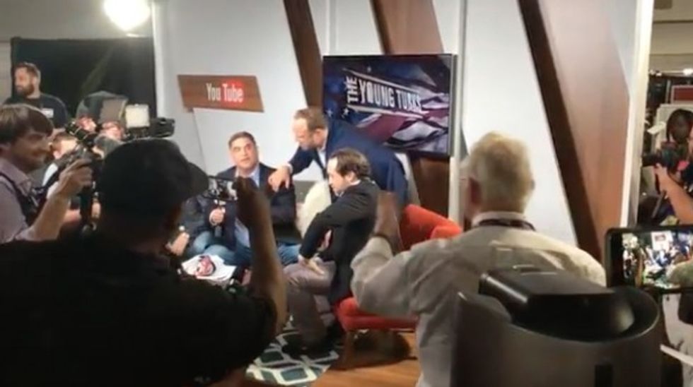 InfoWars founder and conspiracy theorist Alex Jones interrupted Cenk Uygur, the liberal host of "The Young Turks," at media row at the Republican National Convention in Cleveland Thursday evening, nearly resulting in a brawl.