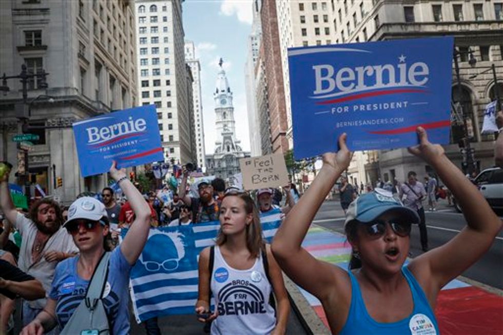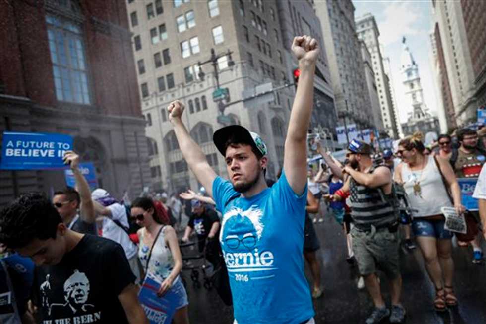 Supporters of Sen. Bernie Sanders, I-Vt., march during a protest in downtown on Sunday, July 24, 2016, in Philadelphia. The Democratic National Convention starts Monday in Philadelphia. (AP Photo/John Minchillo)
