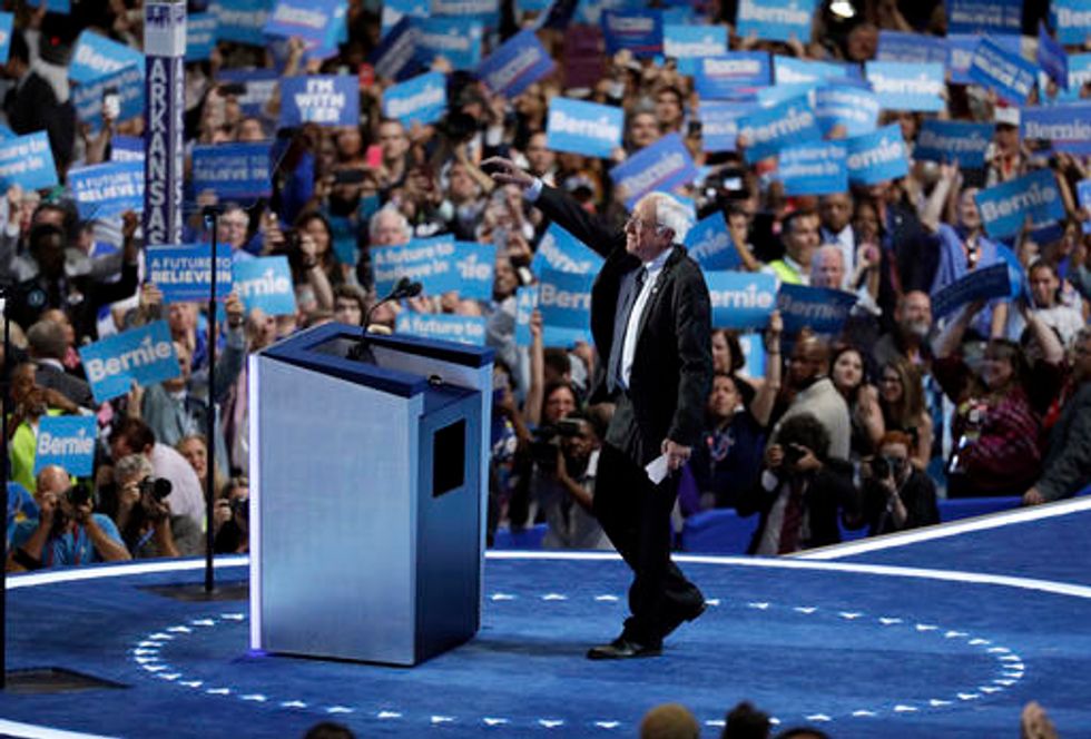 Sen. Bernie Sanders, I-Vt., waves as he walks off the stage after checking out the podium before the start of the first day of the Democratic National Convention in Philadelphia, Monday, July 25, 2016. (AP Photo/Carolyn Kaster)