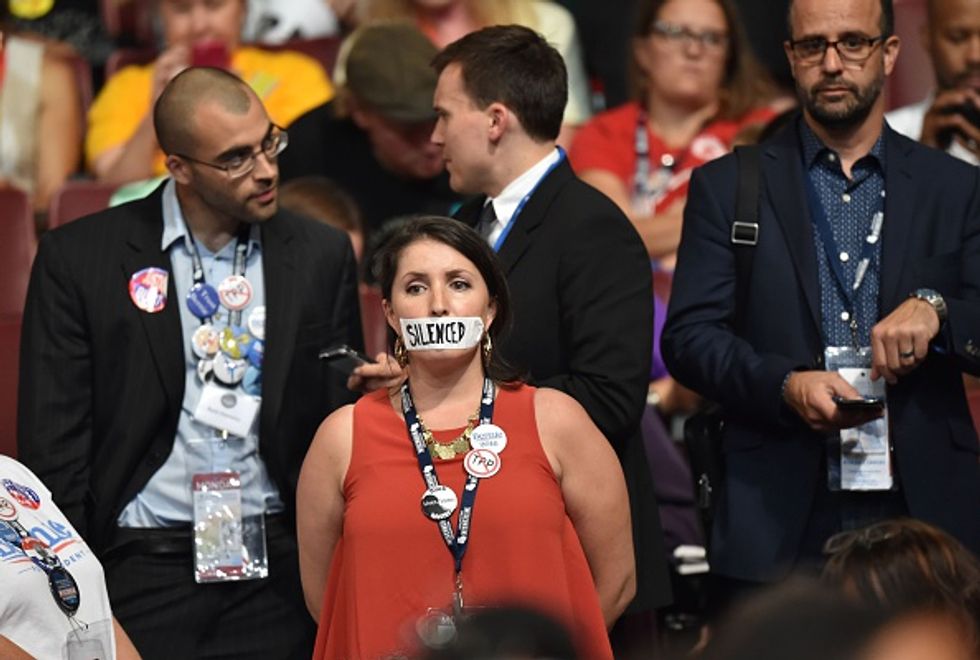 Thousands of Sanders supporters and anti-Clinton demonstrators took to the humid streets Monday and Tuesday to protest, and delegates packed the Wells Fargo Arena with duct tape covering their mouths to symbolize their voices being silenced.