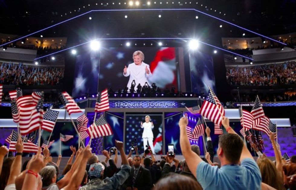 Democratic presidential nominee Hillary Clinton gives her thumbs up as she appears on stage during the final day of the Democratic National Convention in Philadelphia, Thursday, July 28, 2016. (AP Photo/Matt Rourke)
